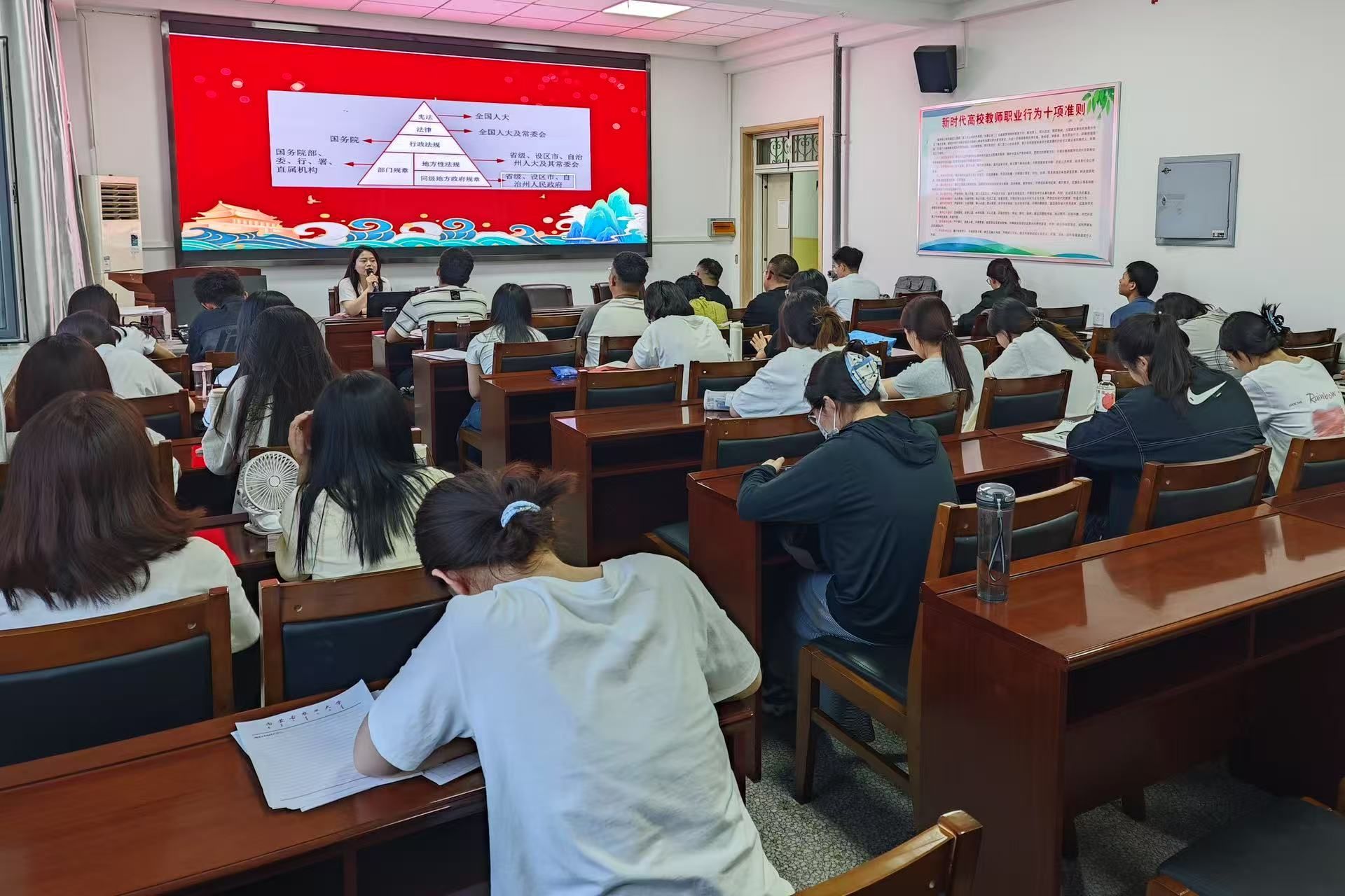党课伊始,乔老师以“铸牢中华民族共同体意识中的法律要求”为题,结合《中华人民共和国宪法》,系统阐述了宪法中维护国家统一、保障民族平等团结等条款,相关条款为铸牢中华民族共同体意识奠定了法治基础。随后,乔老师深入解读了《中华人民共和国民族区域自治法》,结合民族工作实践,剖析民族区域自治制度的内涵与价值,以及该法对民族地区发展和民族团结进步的重要意义。最后,乔老师通过案例与条文解读,帮助发展对象理解法治体系架构,明确法规在基层治理和地方发展中的规范与推动作用。