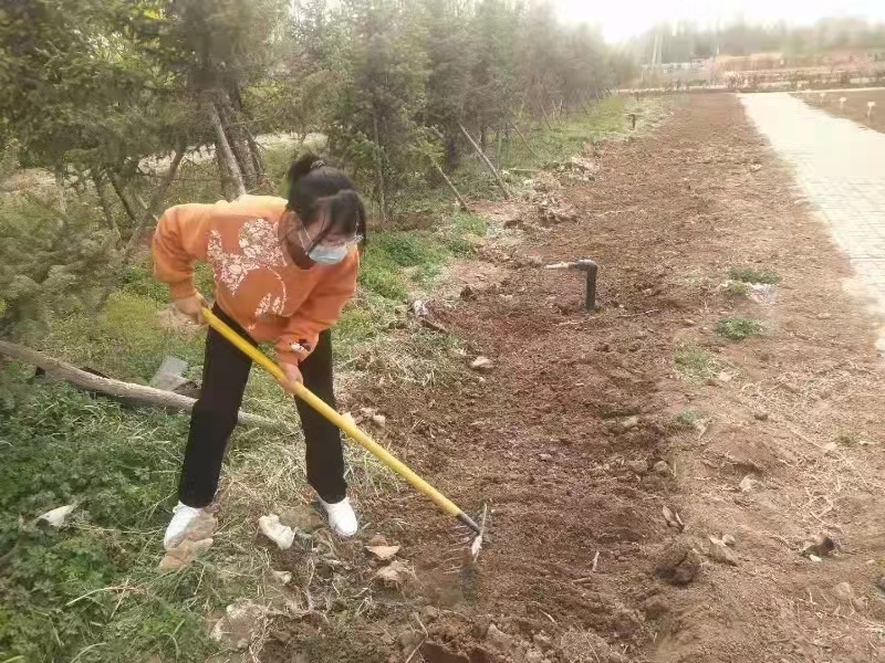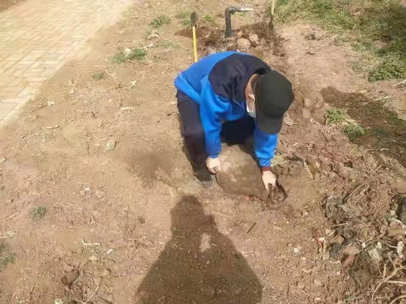 此次义务劳动的主要任务是修整绿化带傍边空地,具体操作由农场周师傅安排布置。由于土地不平整,且土壤结块严重,异物垃圾较多,严重影响机械化耕作,为了解决这个问题,党员们纷纷拿起圆锹将边缘给铲齐,将地块的凸起部分铲平。另外,有一小块地石头很多,铁锹铲不动,党员们想别的办法,找到石头的边缘,用铁锹将石块撬出。