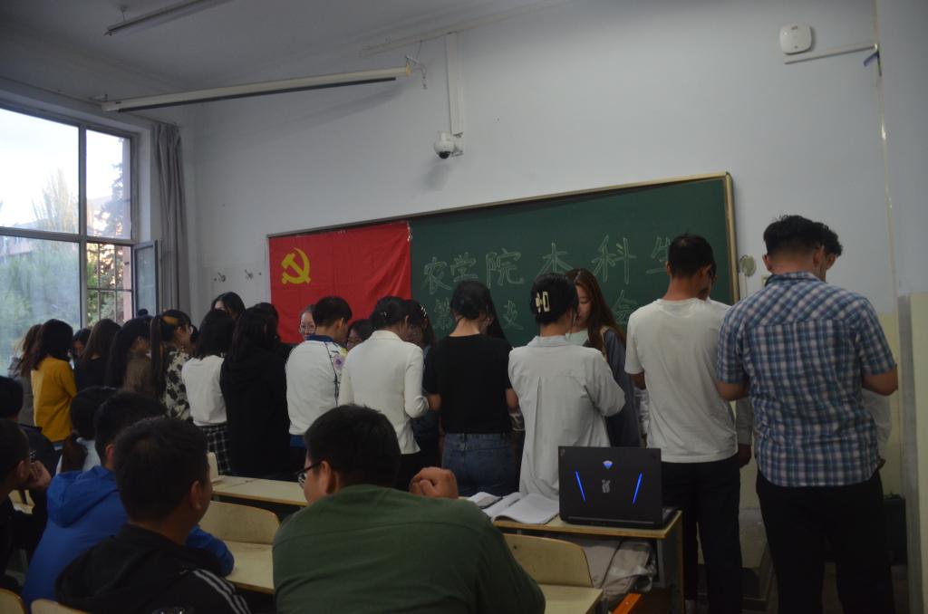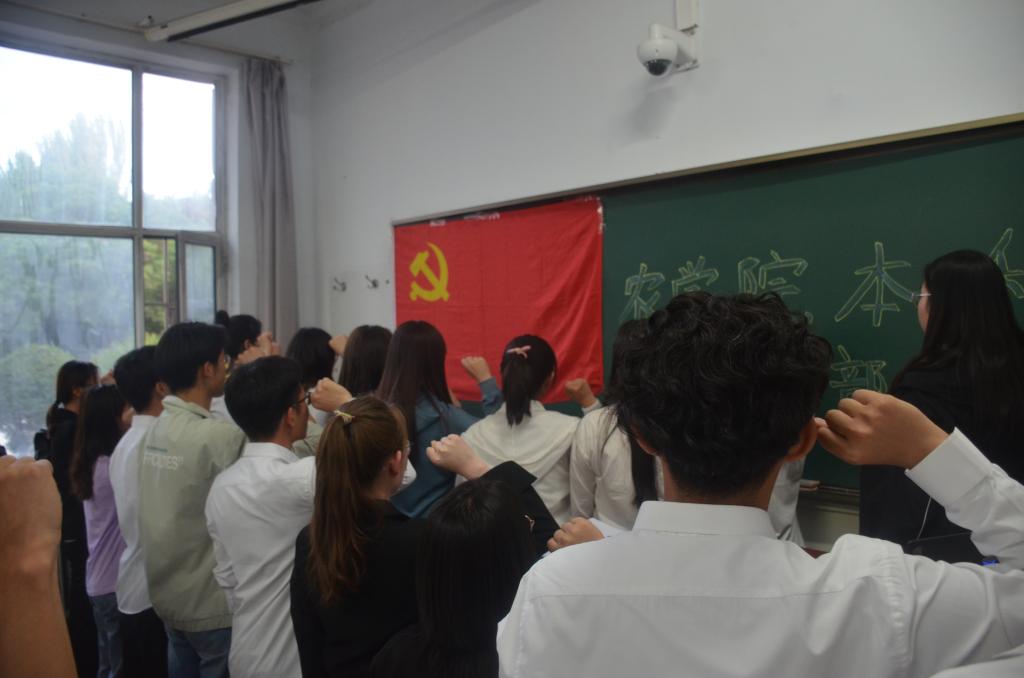 在张海杰老师宣布参会基本情况后,大会伴随着党员们齐唱国际歌正式开始。首先,张老师宣读了拟发展党员的名单并指出,由于发展人数超过一个人,需要逐个讨论。其次,拟发展党员们结合积极分子培养期间的自身情况及存在的不足向大会做汇报,并由2名培养联系人对其做出真实、客观的评价。再其次,在场具有表决权的全体党员经匿名的形式进行投票。最后,经过支部党员表决,李伟等8人被顺利接收为我支部的预备党员。会后,正式党员为新发展党员佩戴党徽,本科生第一支部联合第二支部的全体党员进行了庄严的入党宣誓仪式。