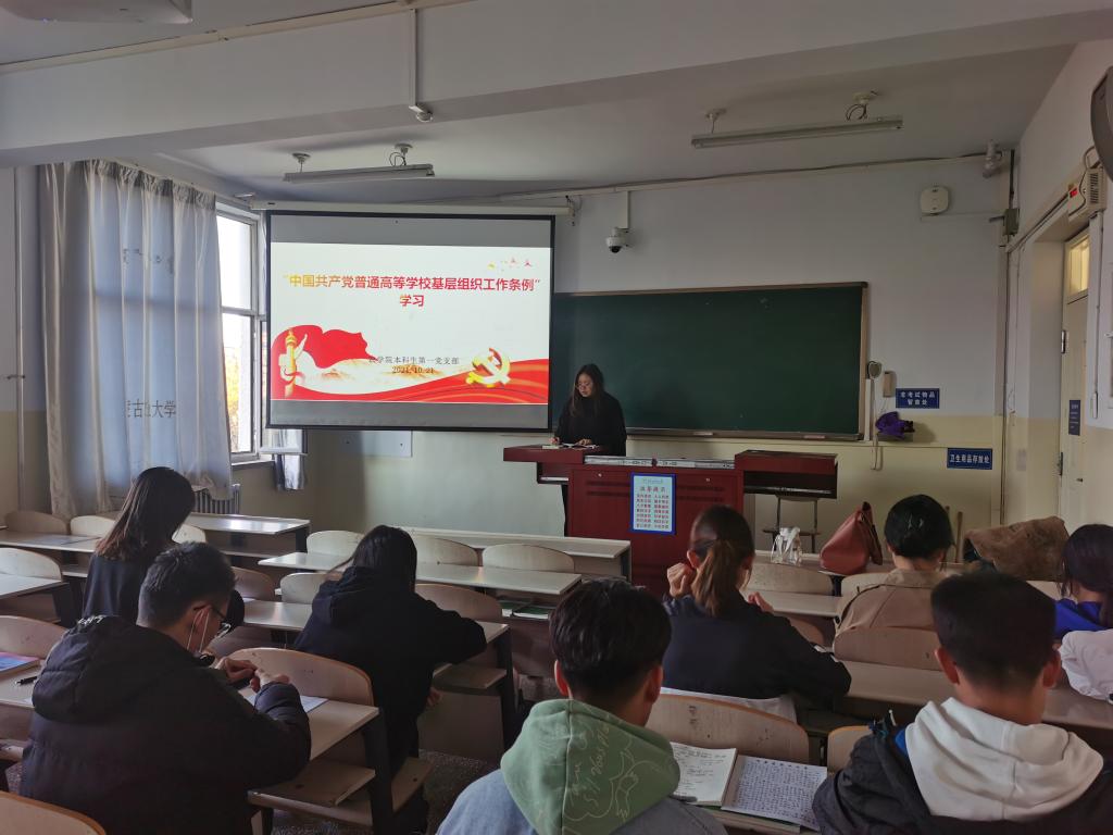 2021年10月21日,下午4:30,本科生第一党支部于东区主楼320教室集体学习了“中国共产党普通高等公司基层组织工作条例”,支部书记张海杰主持会议并领学,支部全体党员均积极参加。