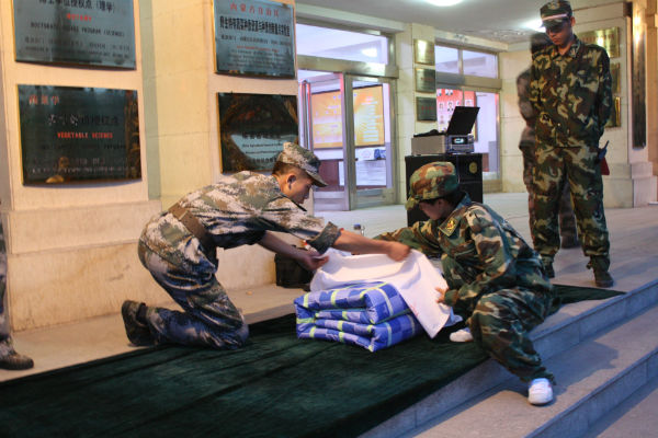 教官首先对同学们的宿舍布局情况进行了总体的评价,对宿舍内务的摆放提出了自己的要求。之后,教官更是亲自上阵,用实际行动向同学们演示了军人标准的内务,首先将被褥铺置整齐,随后再用边操作边讲解的方式指导新生如何能够迅速而整洁的铺好床单。最让新生们期待的莫过于在电视里见到过无数次的将被子叠成“豆腐块”的形状了。看似简单的叠被子,其实是深藏着许多学问的,同学们都好奇的看着教官以熟练的手法叠着本来就软塌塌的被子,不一会儿,一床整齐的被子便展现在了大家面前。