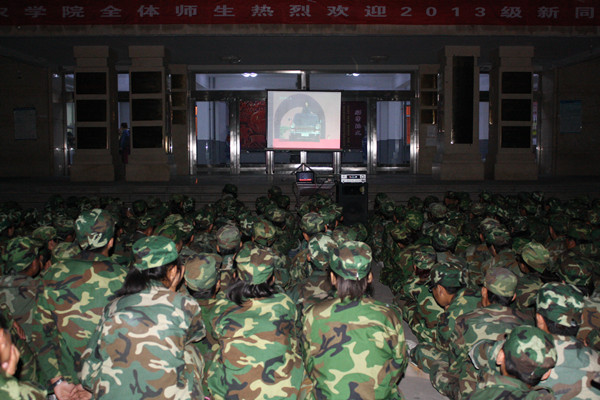 影片中,60周年国庆阅兵式上,各个阅兵方阵的战士们步伐整齐,步子有力,人人精神抖擞地通过天安门广场。响亮的口号声回荡在空中。大一新生认真的观看着影片,不时为影片中的战士们鼓掌喝彩。他们深深地感受到,配合是整个方队的核心;团结是整个方队的支柱;坚持是整个方队胜利的标志。
