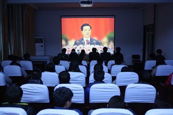 同学们认真听取了胡锦涛总书记的大会总结。了解了中国近5年来经济、政治、国防方面获得的成绩以及存在的不足,明确了我们在新时期的目标,更加坚定了同学们努力学习,报效祖国的伟大决心。