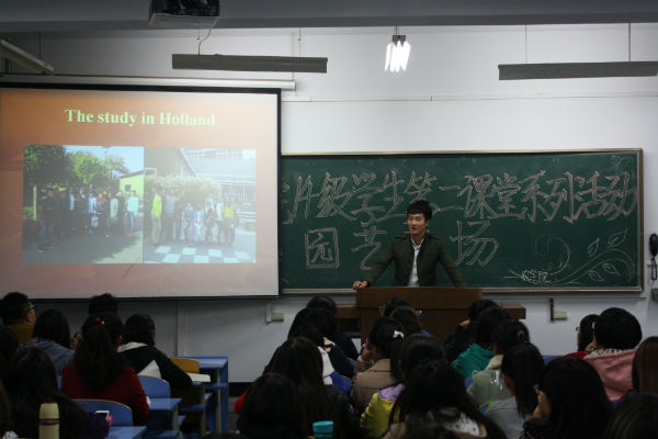 活动中,辅导员向同学们介绍了开展“第二课堂”是为了加强同学们对本专业所学知识的了解。接着徐忠山同学结合他在荷兰学习期间的经历向同学们讲述了有关花卉、蔬菜种植、培育等方面的知识,并通过ppt和图片解说的方式,使同学们对所讲内容有了更加深刻的印象,也让同学们对所学专业知识有了进一步的认识。