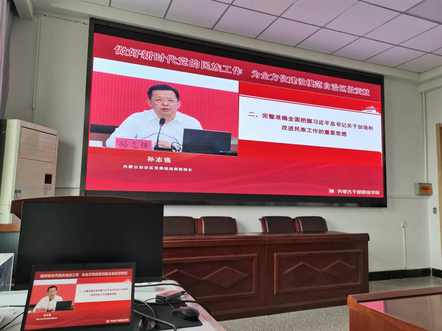 在“民族政策宣传月”和“民族法治宣传周”主题教育活动期间,5月23日下午,公司组织教职工依托“内蒙古干部网络公司”平台开展视频集中学习内蒙古自治区党委统战部副部长孙志强讲授的“以铸牢中华民族共同体意识为主线,全方位建设模范自治区”专题课程。