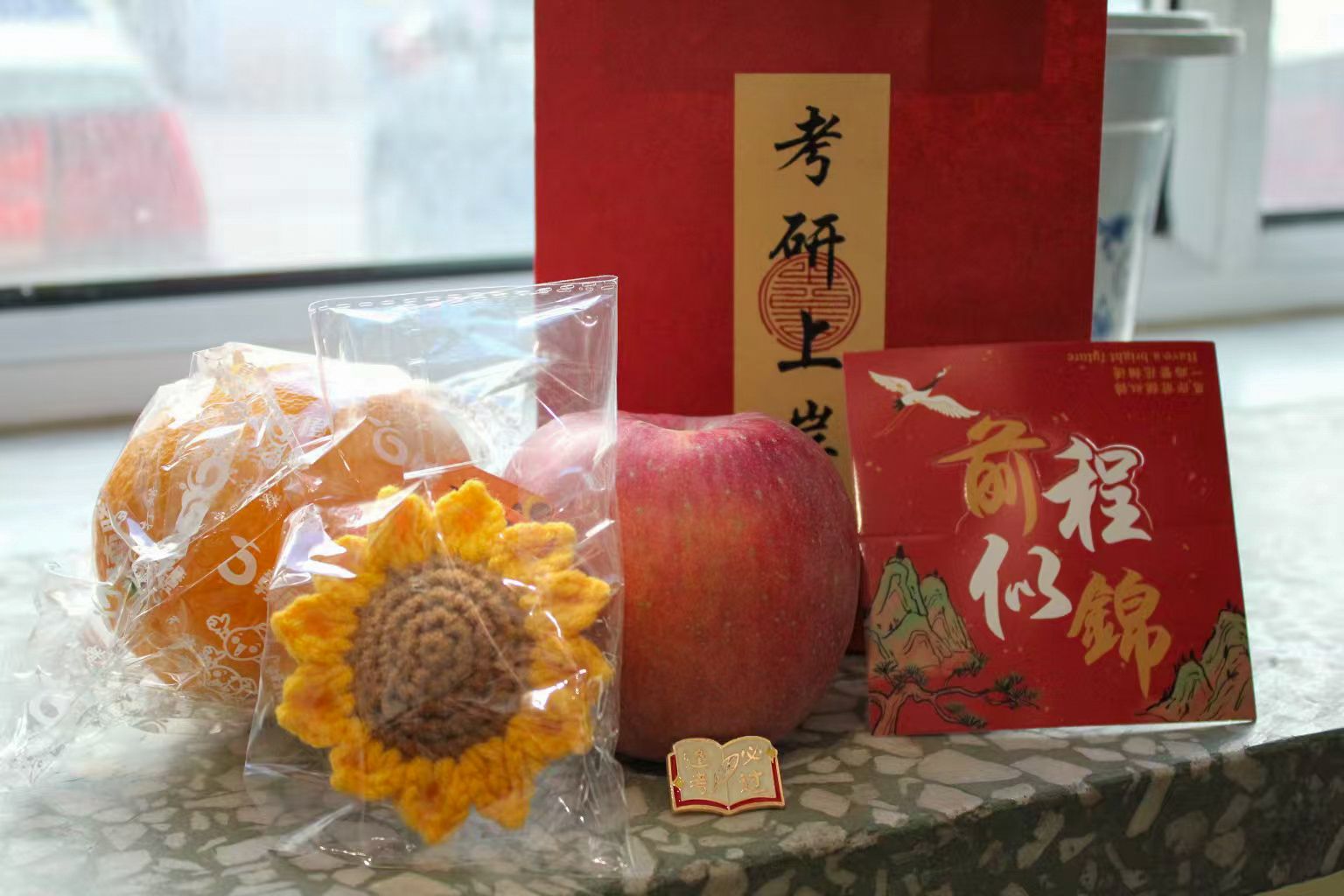 “加油包”内的物品丰富且寓意深刻。橙子金黄灿烂,正如考研学子们心中熠熠生辉的梦想。“橙” 风破浪、心想事 “橙”、“橙” 功上岸,这一个个谐音背后,是对学子们能冲破考研重重困难,收获成功的殷切期望。苹果,向来象征着平安与平稳,在此刻更是承载着 “苹” 稳上岸的美好祝愿,愿学子们的考研之路一帆风顺,毫无波澜地抵达理想的彼岸。精致的向日葵钥匙链,迎着阳光绽放,激励着学子们在考场上一举夺 “葵”,这枚逢考必过的勋章,更是如同赋予了他们战无不胜的勇气与信念。