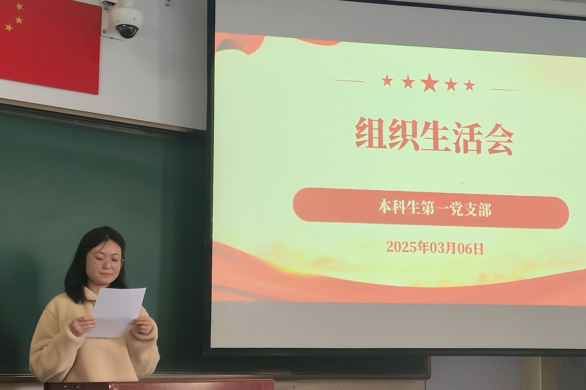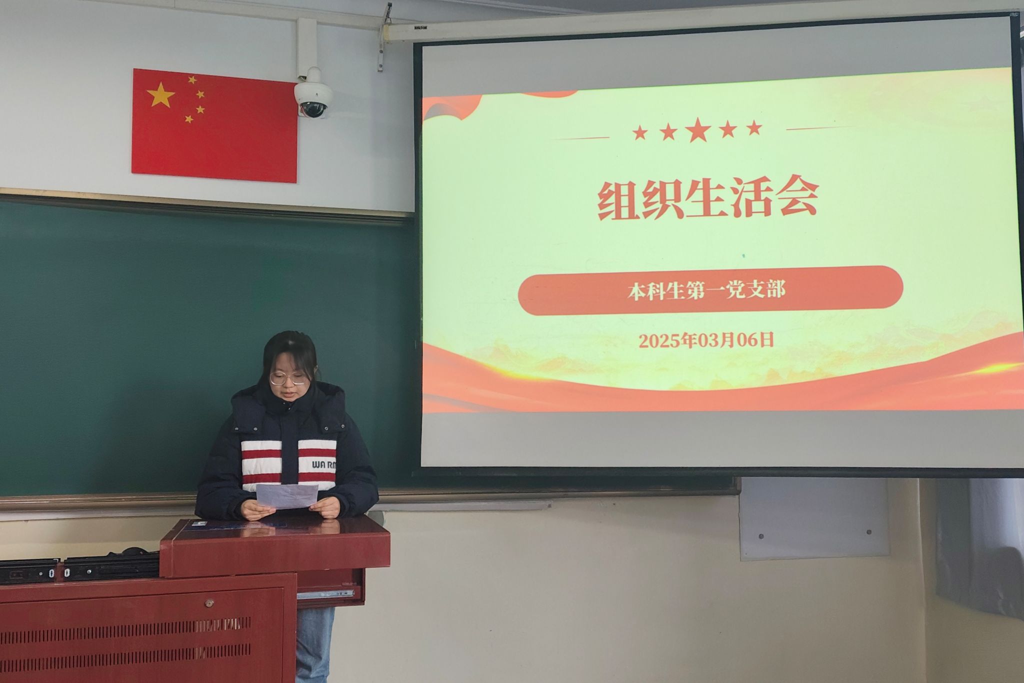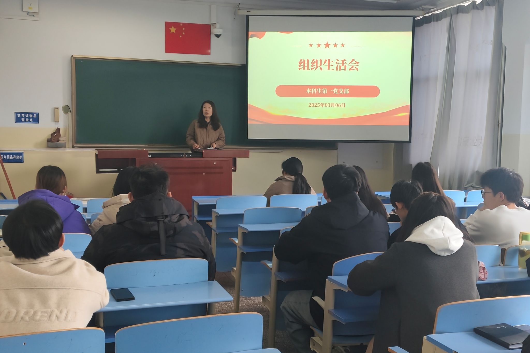 2025年3月6日,本科生第一党支部于东主212教室召开2024年度组织生活会暨民主评议党员会。党支部书记张海杰主持,支部全体党员参会。会议紧扣“理论学习、党性锤炼、履职担当”主题,通过总结工作、查摆问题、批评与自我批评、民主评议等环节,推动支部建设与党员素质双提升。
