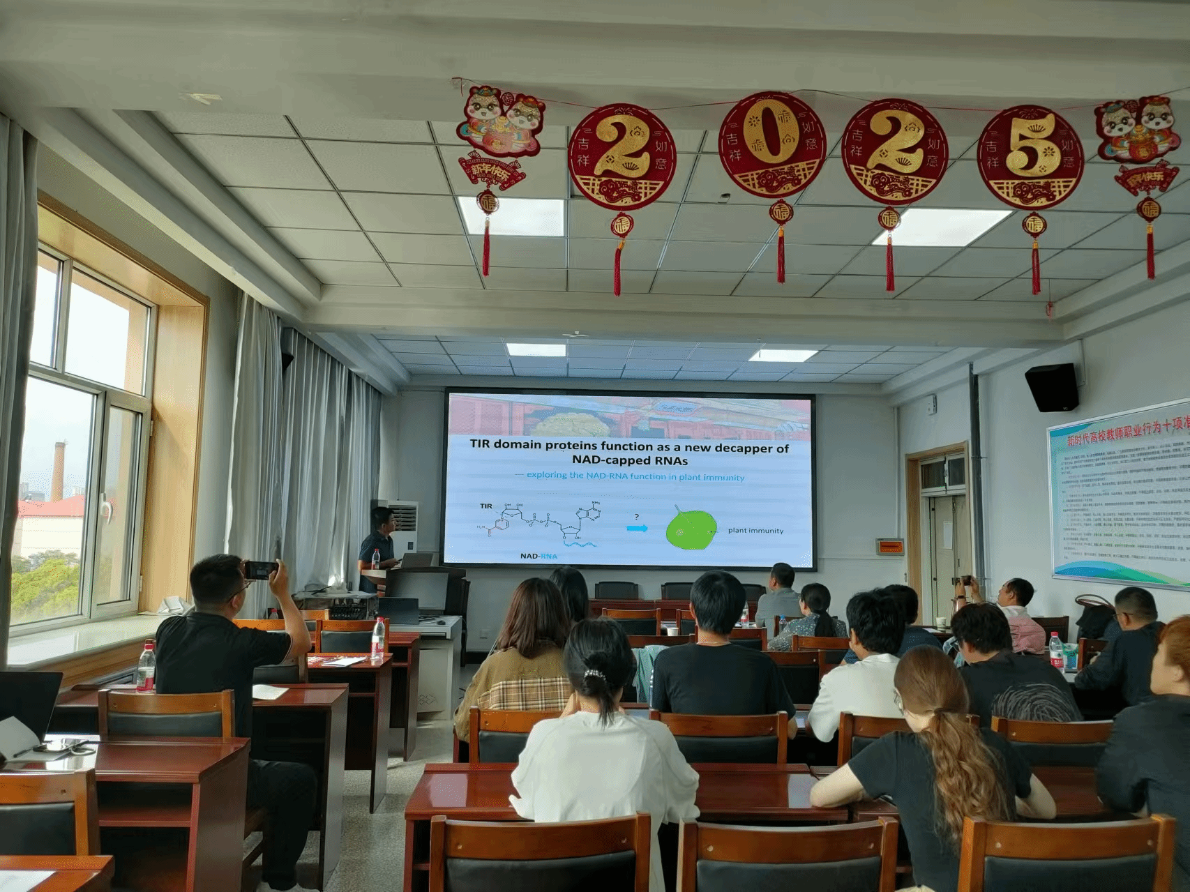 王旭峰助理研究员做题为“TIR domain proteins function a new decapper of NAD-capped RNAs”的学术报告,内容围绕植物中NAD+帽子修饰的RNA的鉴定,并对首次发现的NAD+修饰的RNA脱帽酶的调控机制及功能解析进行论述,为植物RNA代谢调控研究开辟了新方向,展现了该领域的前沿研究动态与应用前景。