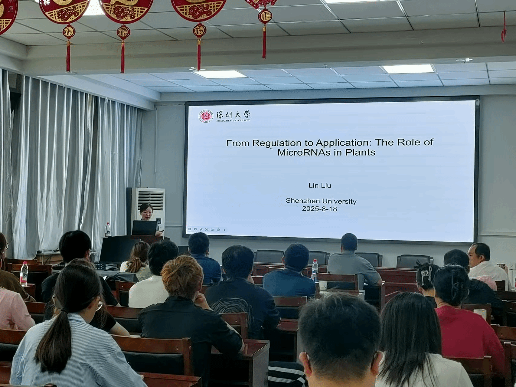 刘琳副教授报告以“From Regulation to Application: The Role of MicroRNAs in Plants”为题,首先介绍了MicroRNAs的调控方式、在植物生长发育、逆境响应中的核心调控作用以及MicroRNAs的常见的研究方法。其次,通过转基因敲除和过表达功能验证、亚细胞定位、降解组测序等一系列试验结果,明确了miR827和miR529调控玉米耐低磷胁迫和生长发育的分子机制,为提高玉米磷酸盐利用效率和培育耐低磷玉米品种提供了宝贵的遗传资源。