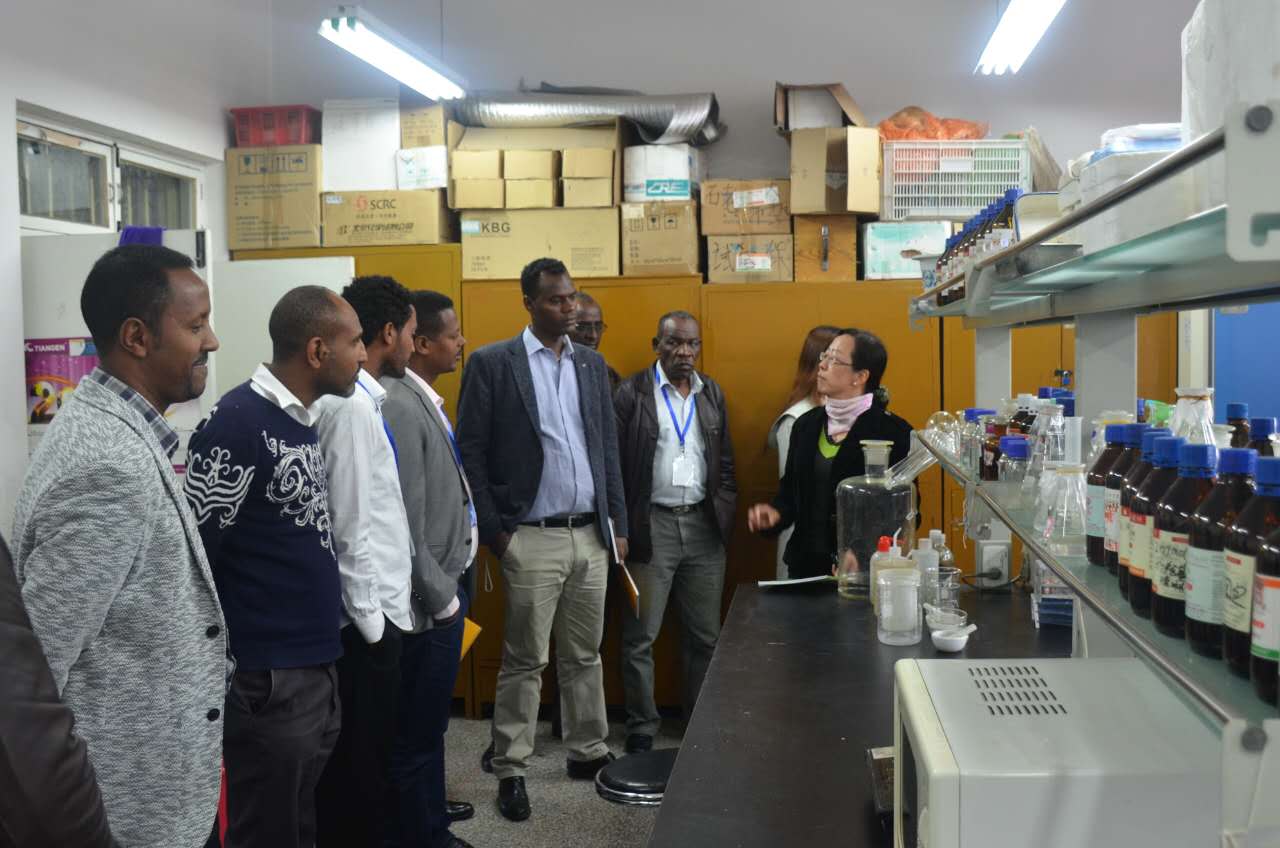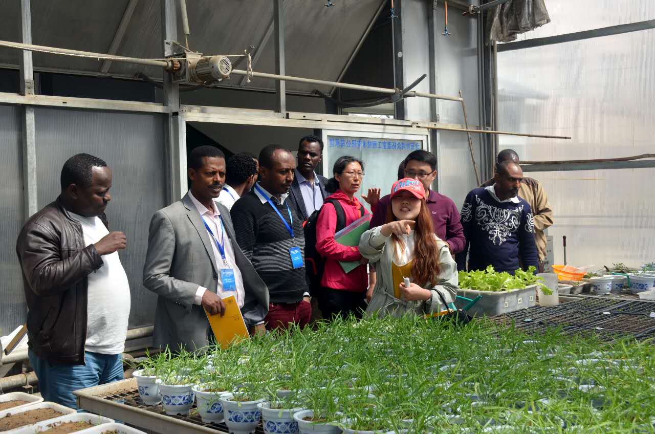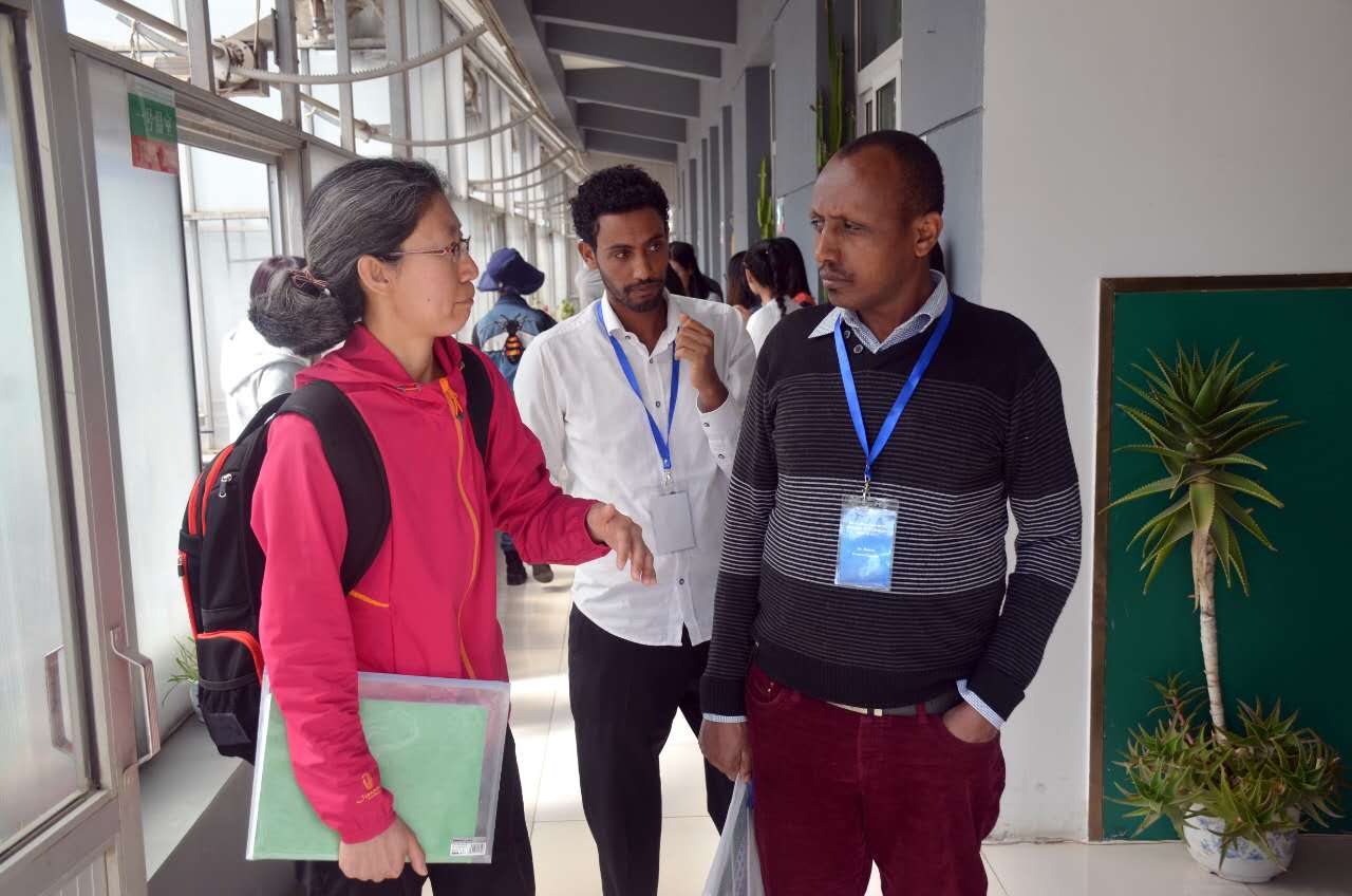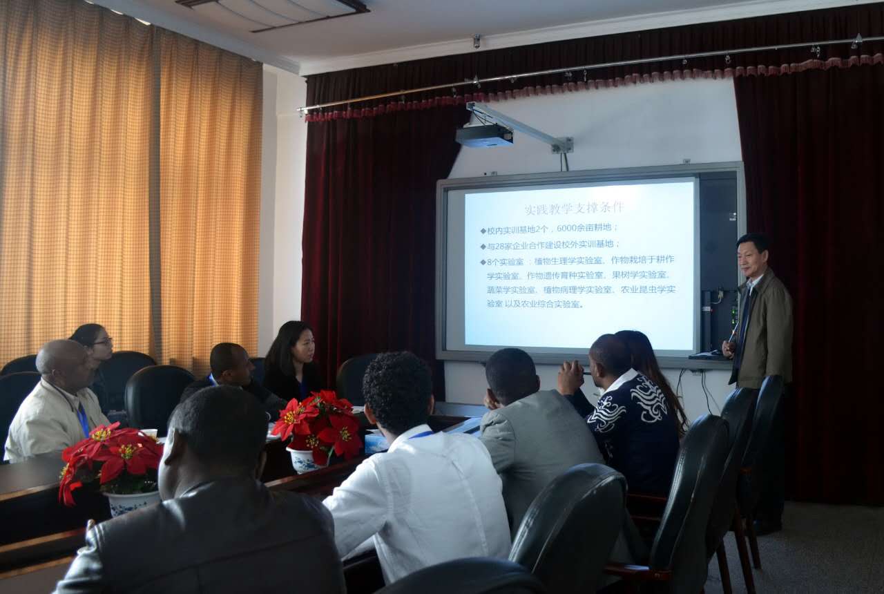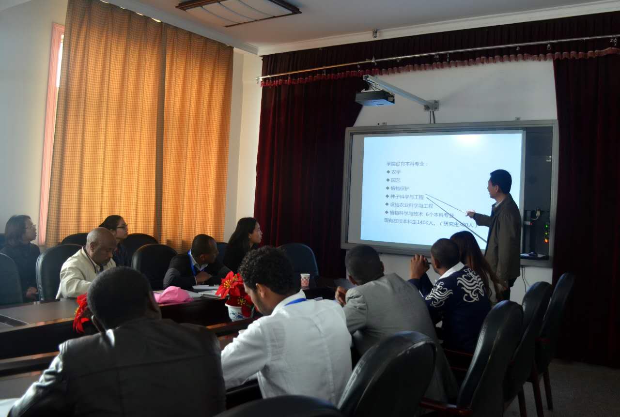 首先,老师们与非洲代表团在公司314室开展了座谈会。会上,樊明寿副经理为代表团详细介绍了公司的团队队伍的组成、实验室的种类、科学研究的方向、科研经费情况。在员工方面,樊明寿副经理重点介绍了员工的就业和创业情况,并以图片的形式详细地介绍了员工的实习生活。会议最后,樊明寿副经理重点讲解了公司的管理体制,即校、院两级管理体制。随后,霍秀文老师带领代表团参观了公司农业生物科学研究中心,果树学、蔬菜育种学等学科的实验室和连栋温室。参观过程中,杨忠仁老师向代表团介绍了内蒙古野生特有蔬菜种质资源与种质创新重点实验室概况和研究方向,同时介绍了温室中栽培的沙葱、沙芥、葡萄、草莓、番茄、辣椒等园艺植物栽培、育苗技术以及温室构造等内容。访问最后,非洲代表团在东区主楼教室了解了公司教学硬件设施、课程教材与员工学习状况。