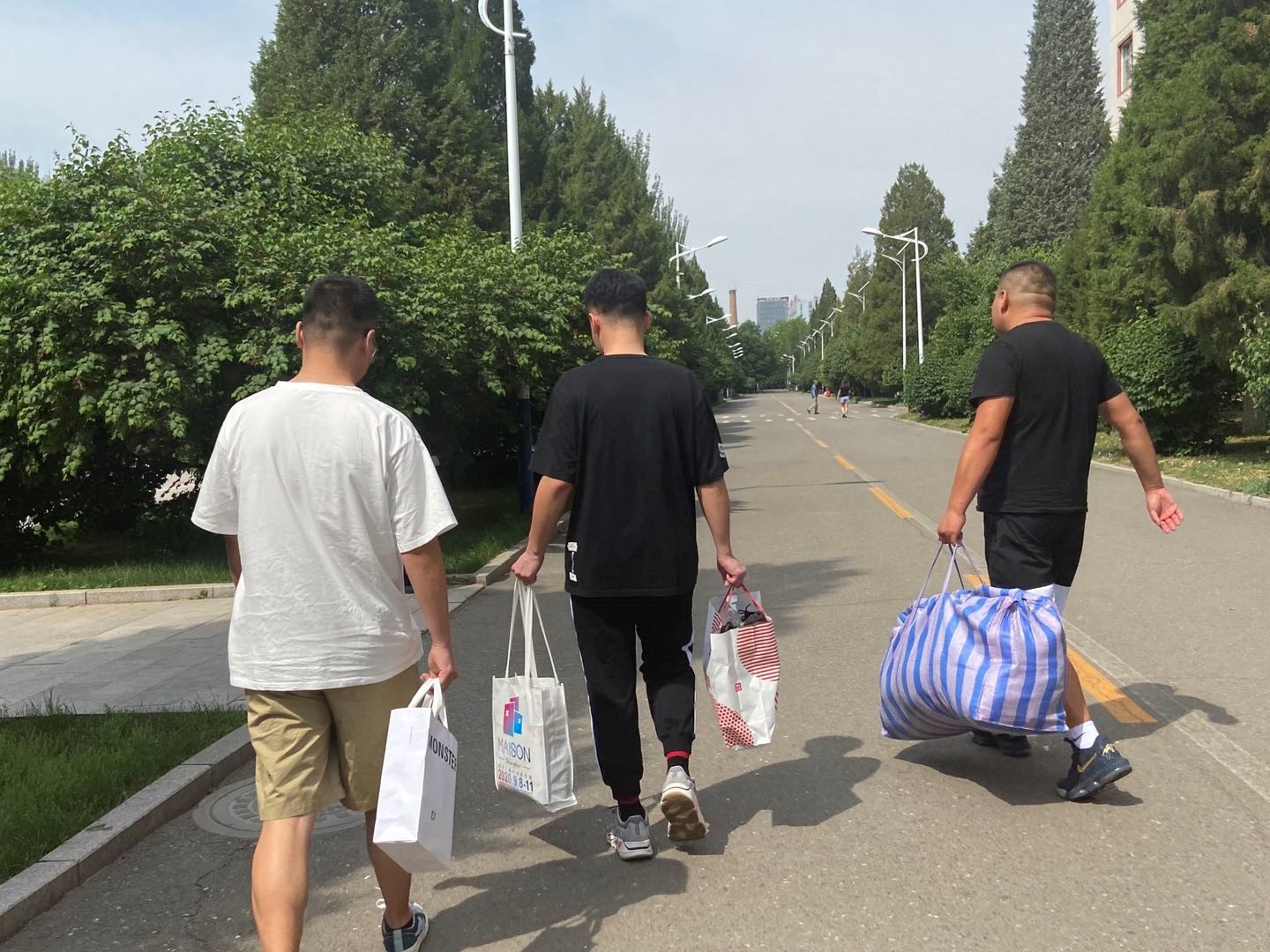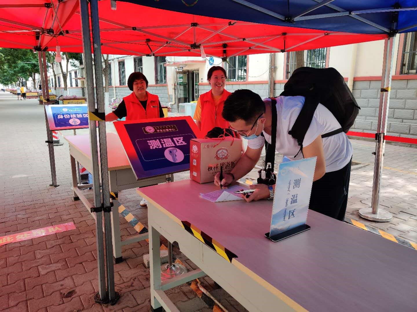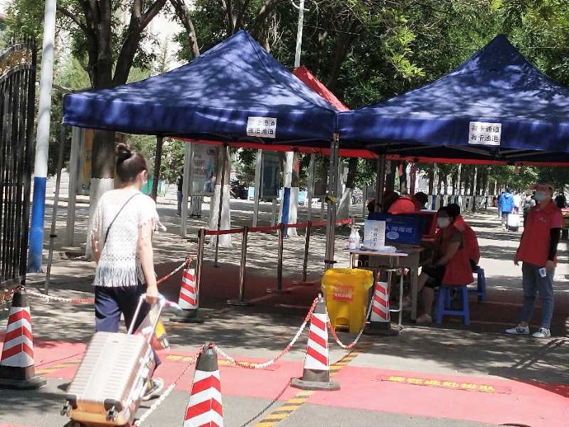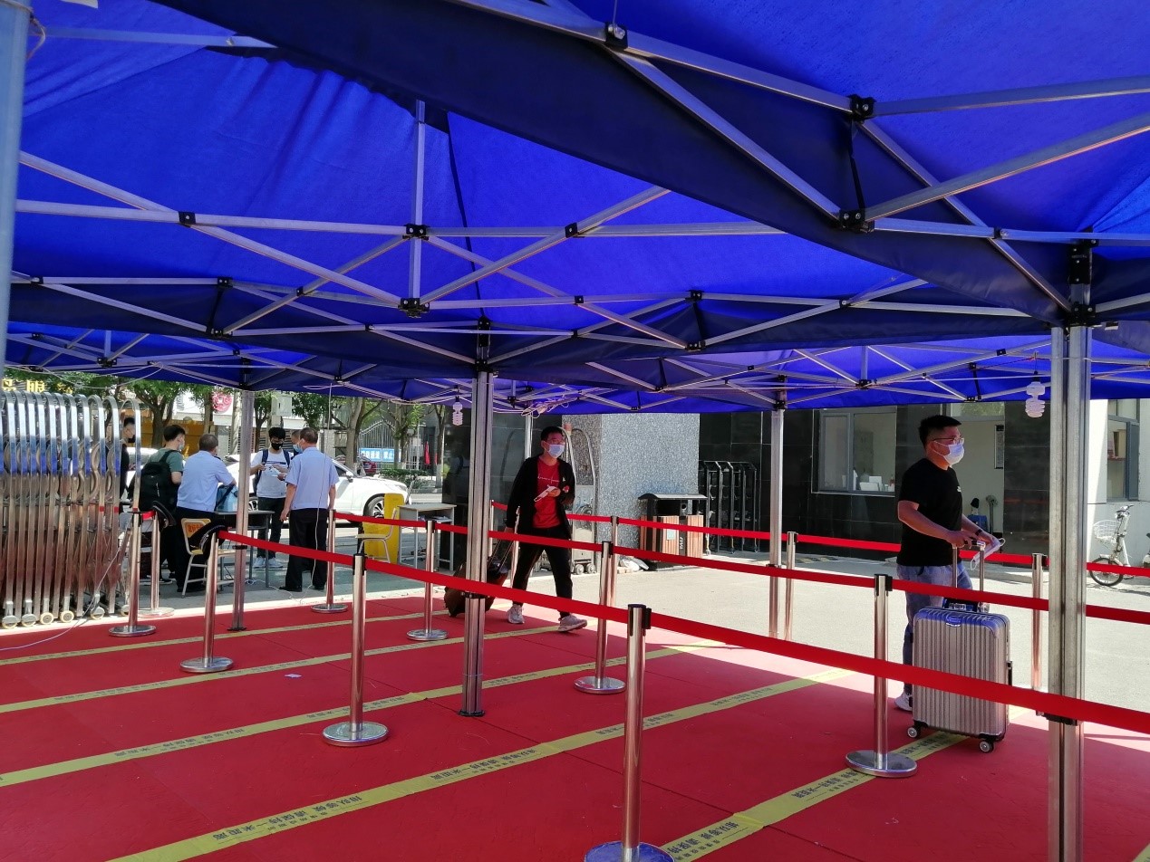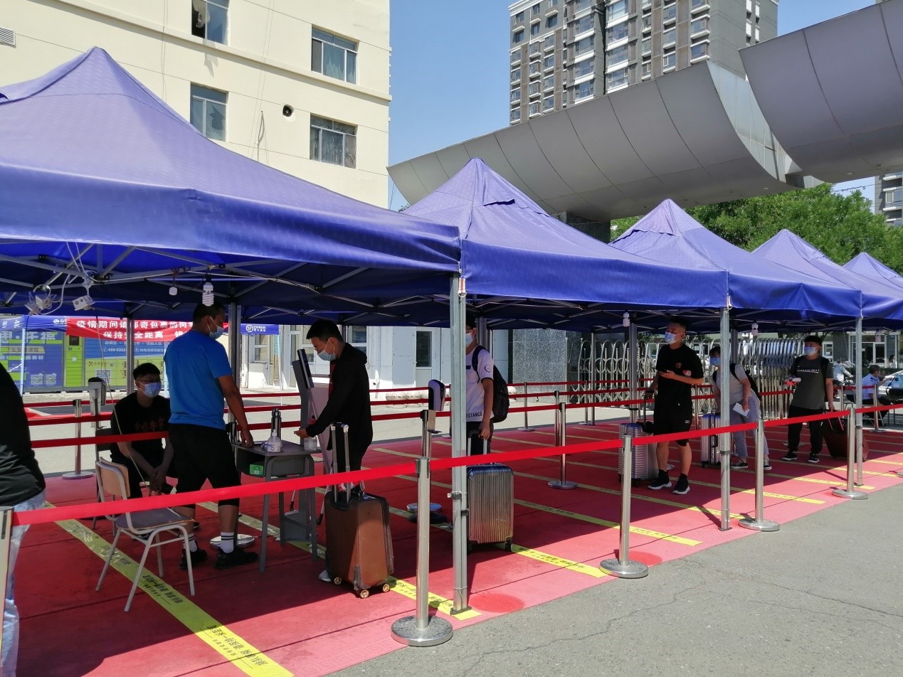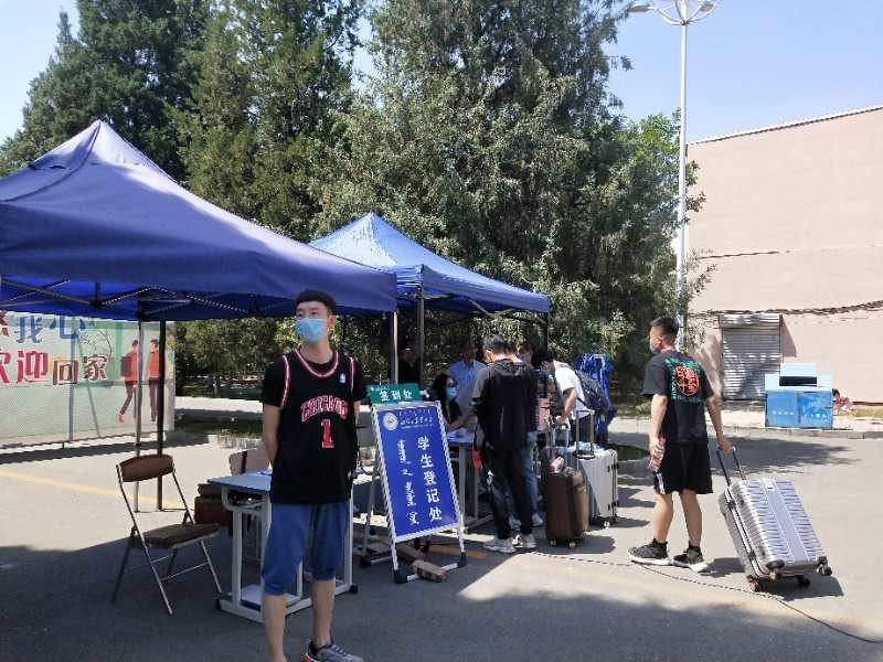 上午,公司毕业生在通过身份验证、携带物品消毒、测量体温、到签到处扫二维码签到一系列程序后,来到公司“营地帐篷”处报到,即可进入校园,回到宿舍。