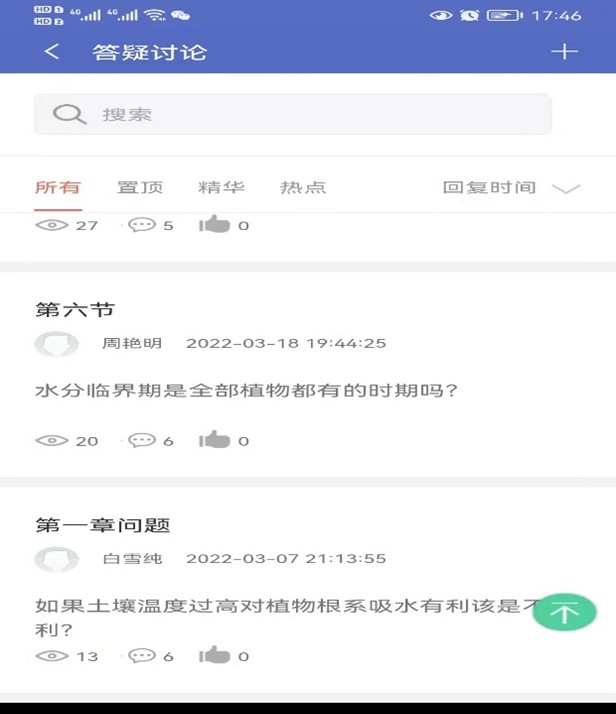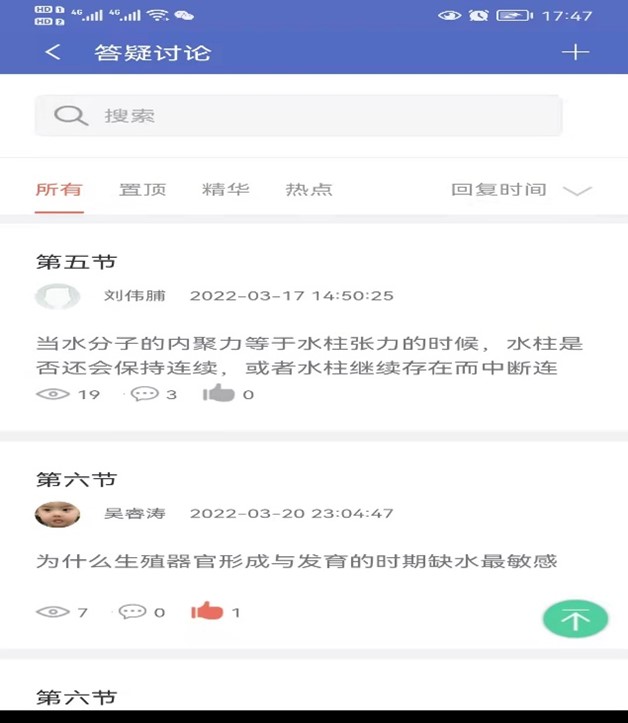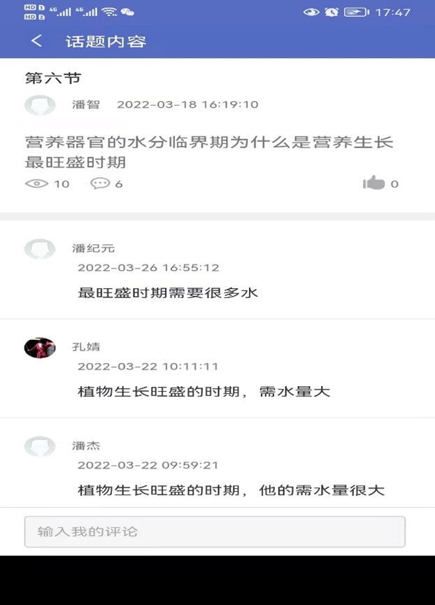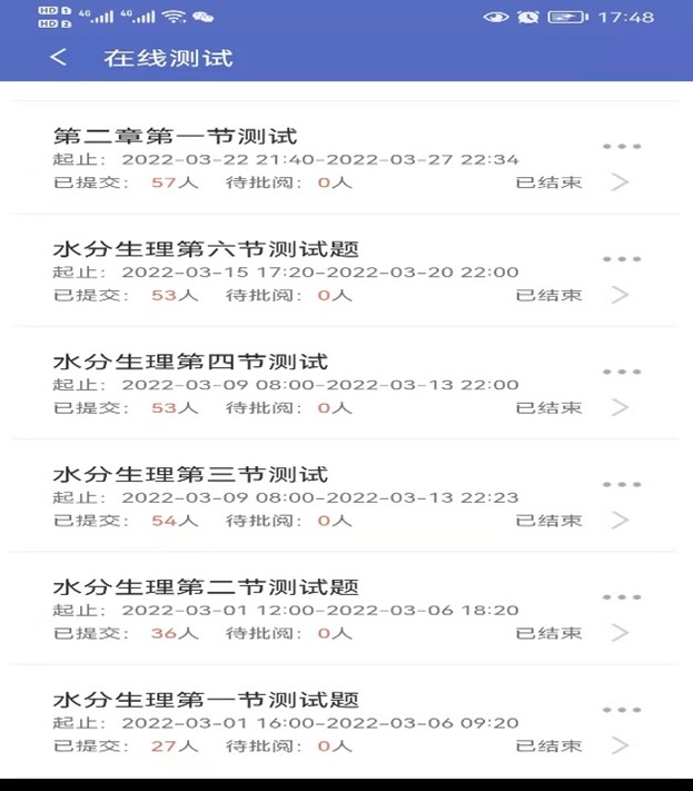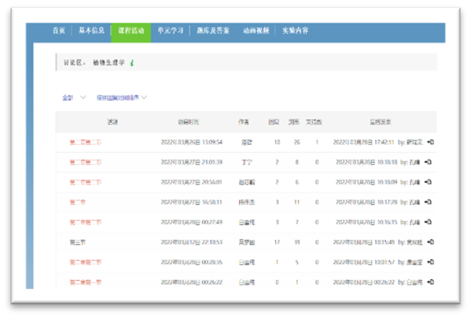本课程前四周为每周一次课,截止撰稿前完成8个学时的课程,按照教学大纲进度,已完成绪论及第一章水分生理的教学内容。教学的具体过程为:课前教师先通过教学平台发布教学任务,让员工在规定时间内完成相应预习及测试,并把预习时存在的疑问发布在讨论答疑区,教师通过大家的提问及预习测试结果,及时调整教学重点、难点;课中教师有针对性的完成讲解并答疑;课后员工完成讨论区的疑问及课后习题。通过微信师生及时互动交流。