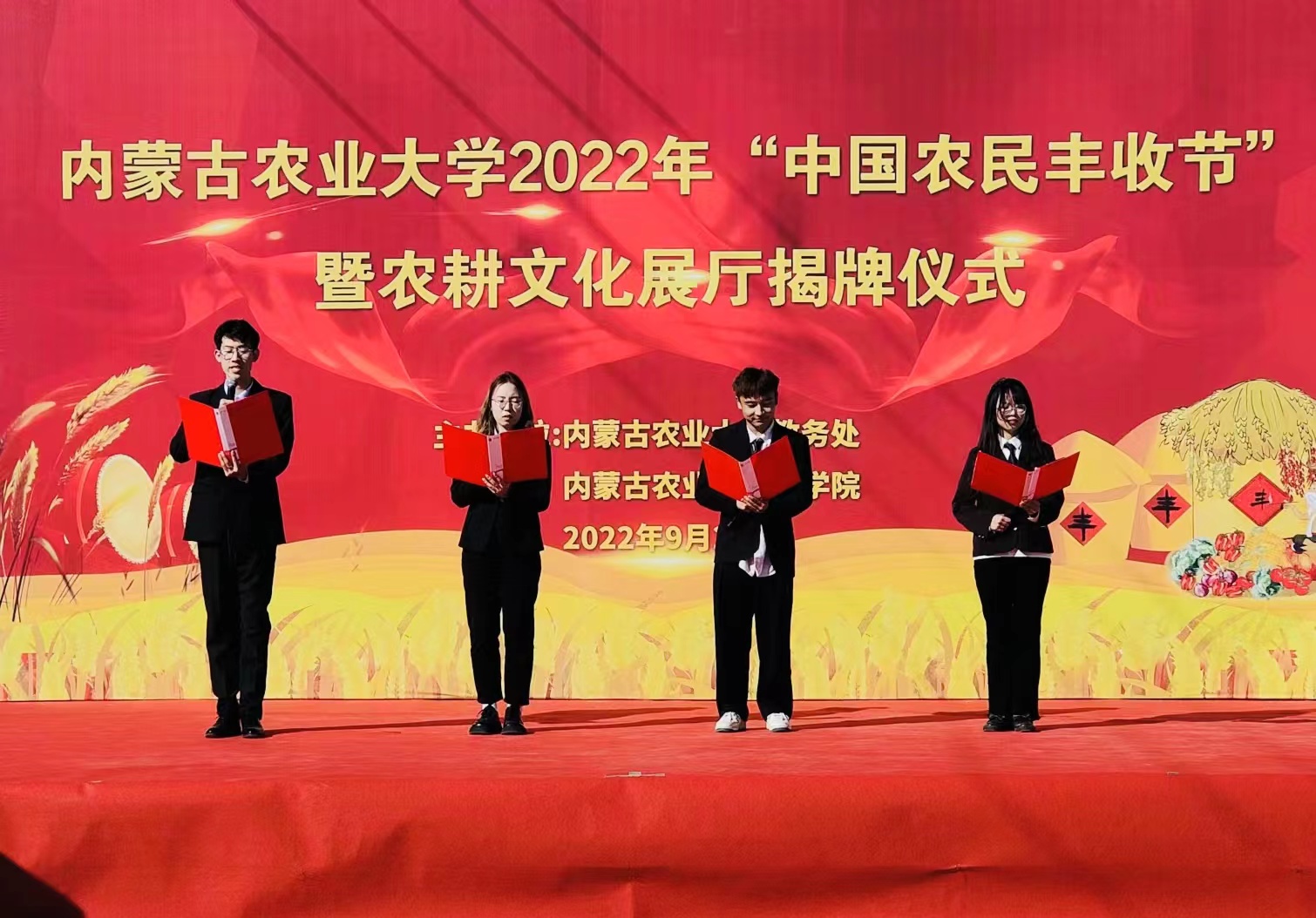第一项议程是“庆丰收”,首先由公司党委委员、副董事长季祥致辞,他表示中华农耕文明是中华民族对人类的重要贡献,希望同学们坚定服务国家“三农”的理想信念,厚植学农爱农情怀,更好地服务国家三农建设,努力发扬不怕苦、不怕累的艰苦朴素的奋斗精神,奋力耕耘,为实现国家农业农村现代化做出自己的贡献。随后,公司党委书记乌拉表示“中国农民丰收节”既是亿万农民庆祝丰收、享受丰收的节日,也是祈愿五谷丰登、国泰民安的国家意志的体现。乌拉书记鼓励公司全体师生都能够按照总书记的指示,牢记使命,勇于担当,以更加奋发有为的积极姿态,扎实工作,努力学习,为推进农业农村现代化建设做出新的更大贡献。庆丰收环节中,同学们还以“诵丰收、唱丰收、舞丰收”等多个节目来庆祝丰收节。