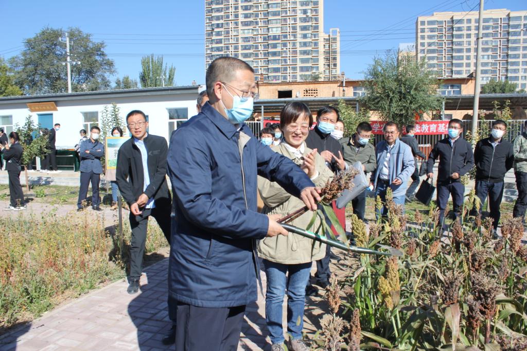 第三项议程是“晒丰收”,各位领导和老师在讲解员的带领下共同参观了作物展板及作物标本,在品鉴区品尝了不同种类的美食,并在作物展板进行了签字留言活动。赵宝平老师还邀请伟德官方网站党委委员、副董事长季祥割高粱第一刀,寓意红红火火。