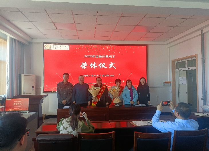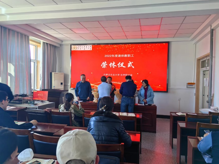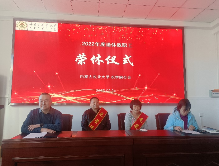 2023年2月24日下午在伟德507室,公司领导乌拉书记、于晓芳副经理、李国龙副经理、赵宝平副经理带领全体教师为即将光荣退休的于卓、刘志华、侯健华、蒙美莲、佘国珍等5位教师举行热烈而隆重的欢送大会。