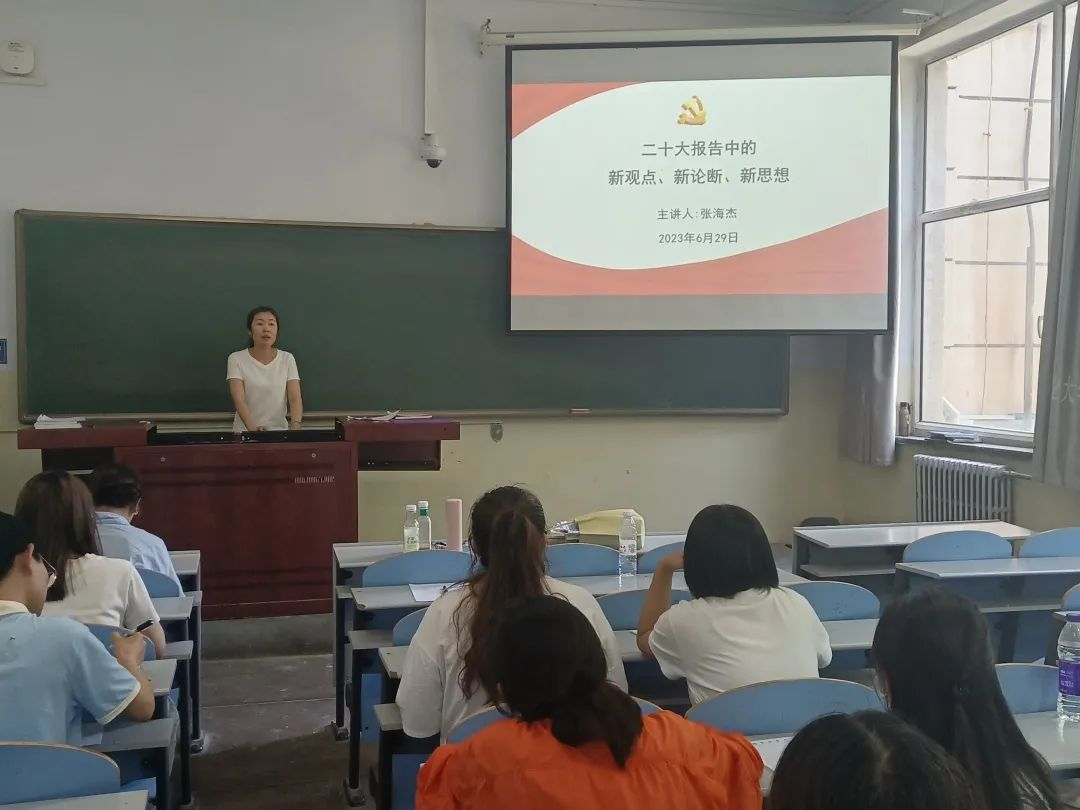 支部书记张海杰老师指出,学习宣传贯彻党的二十大精神是当前和今后一个时期全党全国的首要政治任务,我们要深刻领会党的二十大精神的实质和内涵要义,切实把思想和行动统一到党的二十大精神上来。她认真梳理了党的二十大报告中的新观点、新论断、新思想,主题鲜明、内容丰富,用通俗易懂的语言对党的二十大精神进行了解读。