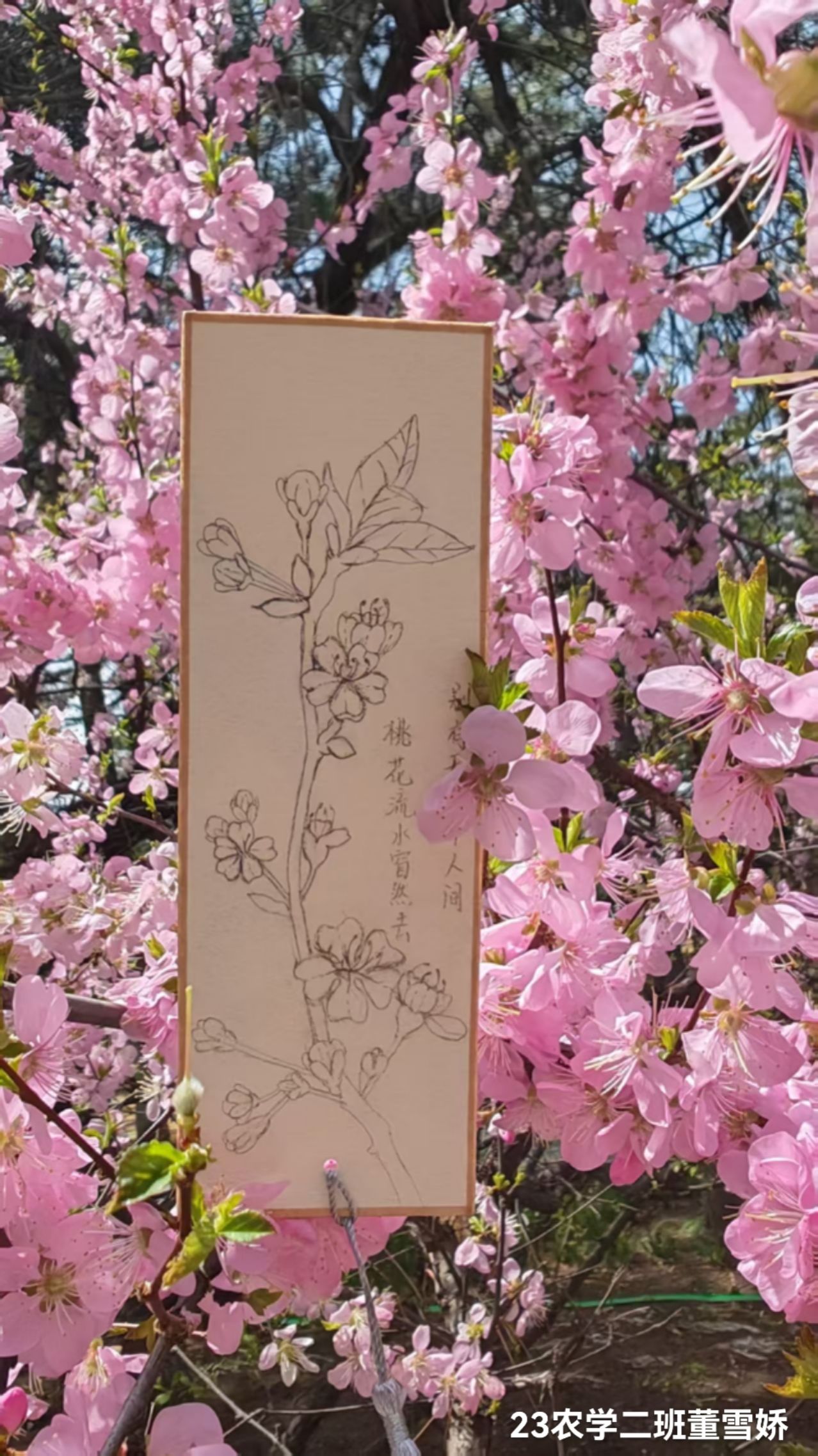 在创作过程中,同学们充分发挥想象力,将对诗词的理解倾注于书签之上。从古典诗词中汲取灵感,结合农学元素,创作出众多精美作品。如有的同学以“桃花流水窅然去,别有天地非人间”为主题,在书签上细腻勾勒桃花枝蔓,展现出春日田园的诗意与美好;还有的同学用“轻舟已过万重山”搭配山川落日图案,以古朴色调传递出豁达心境;更有的同学勾勒桂花枝叶,配上“人闲桂花落,夜静春山空”,营造出静谧悠远的意境。活动期间,同学们各展才华,用手中的笔在书签上绘下了自己心目中最美的春日景象。同学们还自发的寻找了校园中美丽的花朵美景与书签搭配,显得整个画面赏心悦目,让人眼前一亮。