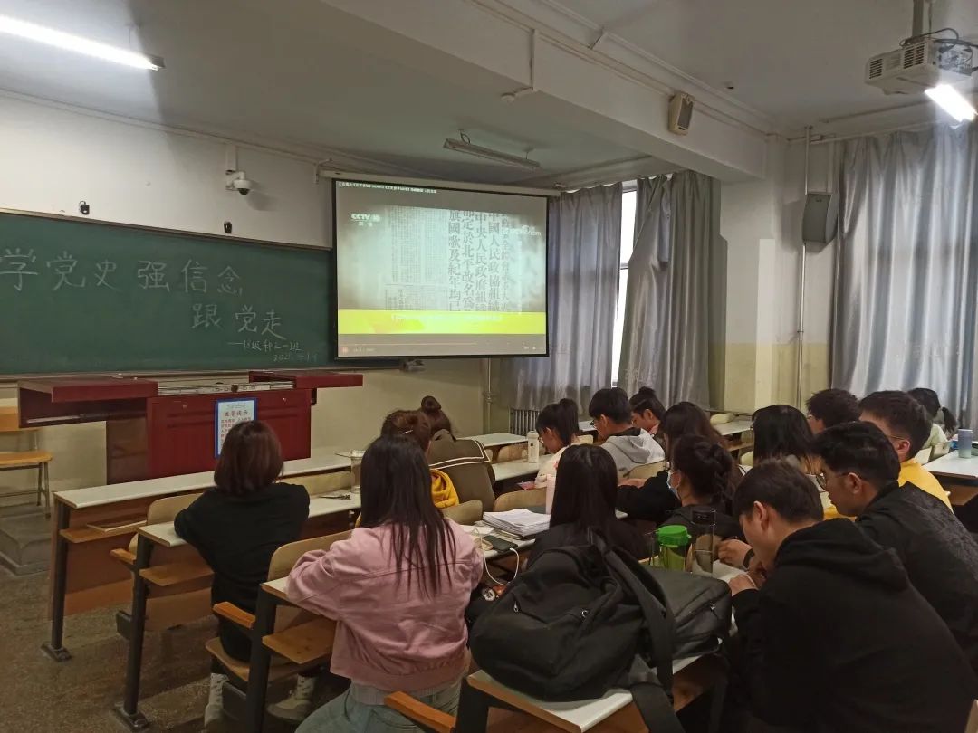 活动伊始,团支书带领同学们观看了《百家讲坛—党史故事100讲》,走进那个年代的中国共产党,了解党团结带领人民为中华民族的发展作出的伟大贡献和根本成就。紧接着,同学们经过讨论后派代表上台与大家分享对党史新的认识与看法,认清当代中国所处的历史方位。活动最后,同学们表达了对党的向往和跟党走的决心。