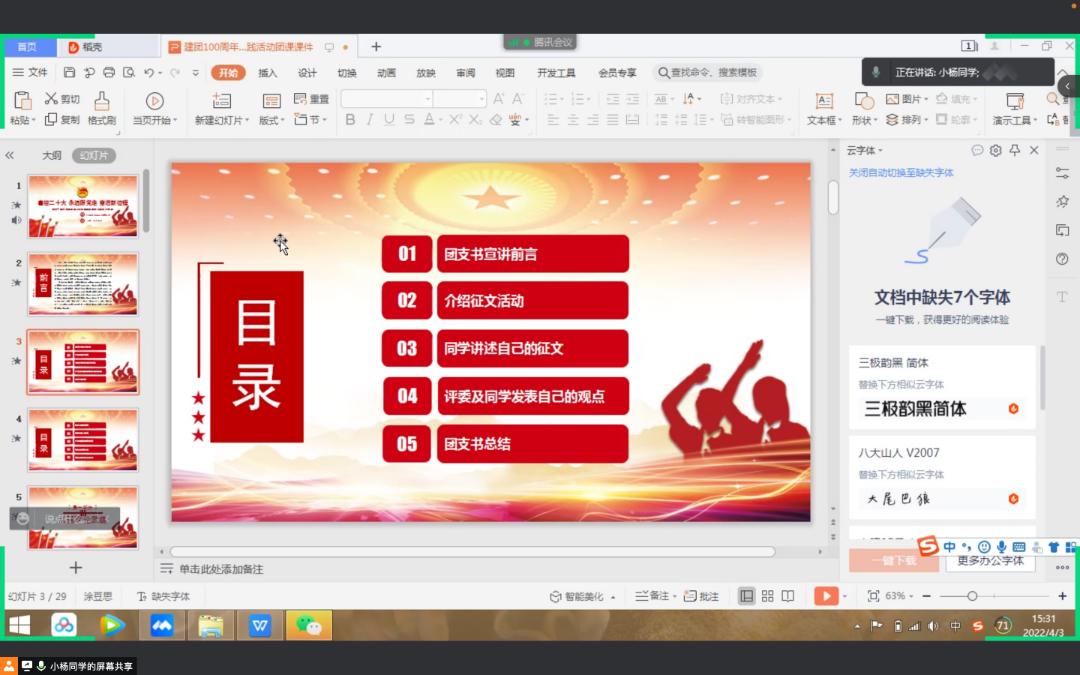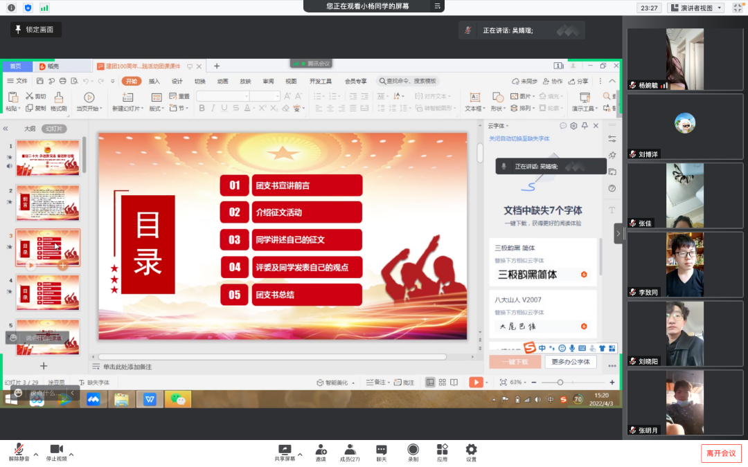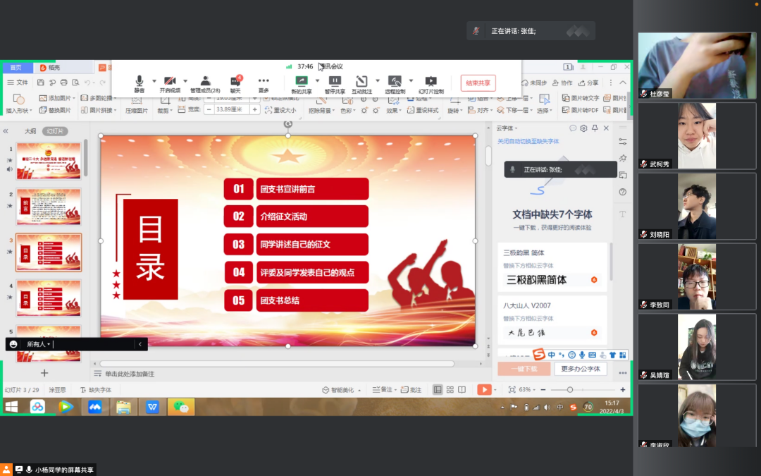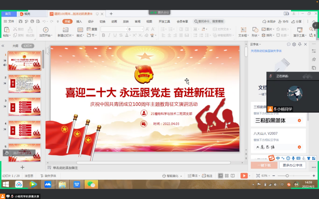 4月3日下午3点,21级植科二班通过腾讯会议开展了“喜迎二十大、永远跟党走、奋进新征程”主题团日活动,团支部全体成员均积极参加。