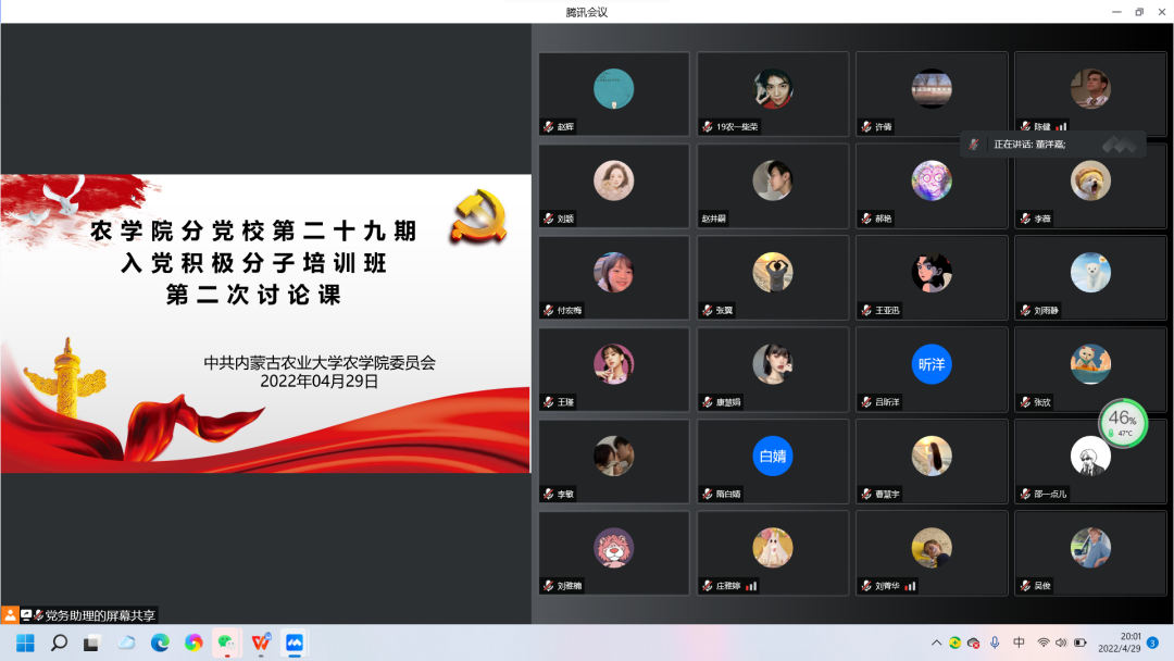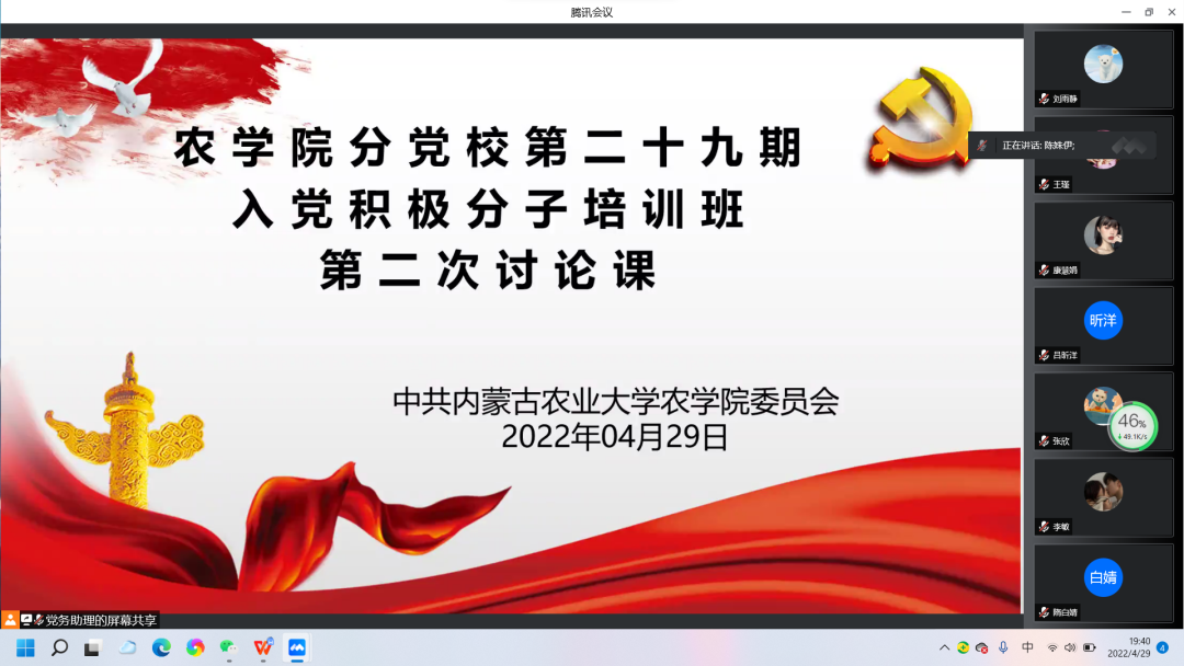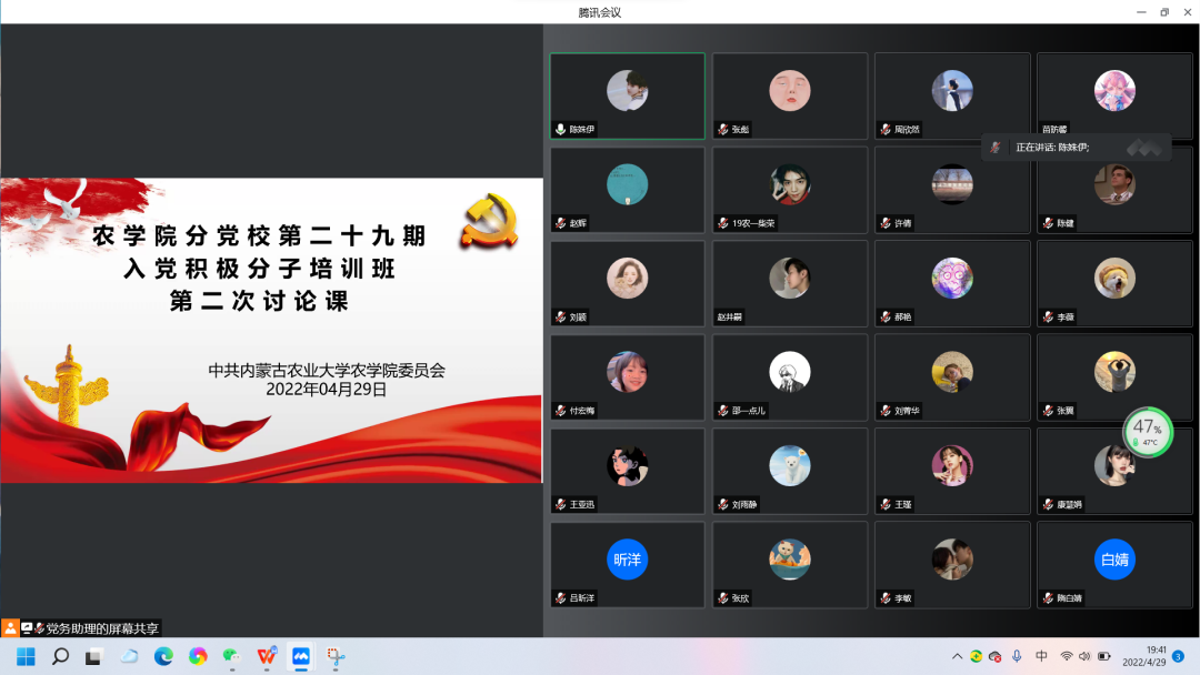 4月29日晚七点,公司通过腾讯会议召开了伟德分党校第二十九期入党积极分子培训班第二次讨论课。本次讨论主题为“回望百年征程,续写时代新章”。会议由党务助理贺奕云主持,第二十九期入党积极分子均参加。