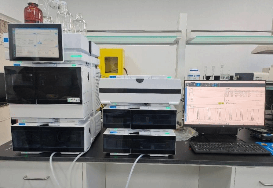 仪器组成:四元梯度泵、独立柱温箱、自动进样器、紫外检测器,荧光检测器,色谱柱,色谱软件及工作站。